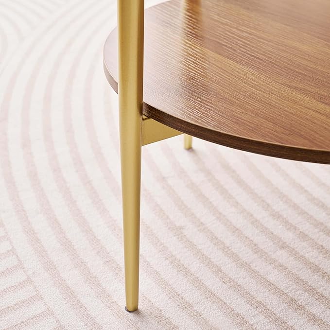 Round Glass End Table, Mid-Century Modern Design Sofa Table for Living Room, D18 x H23, 2-Tier Structure, Amber Glass Top and Walnut Shelf, Sleek Conical Legs with Gold Finish Frame