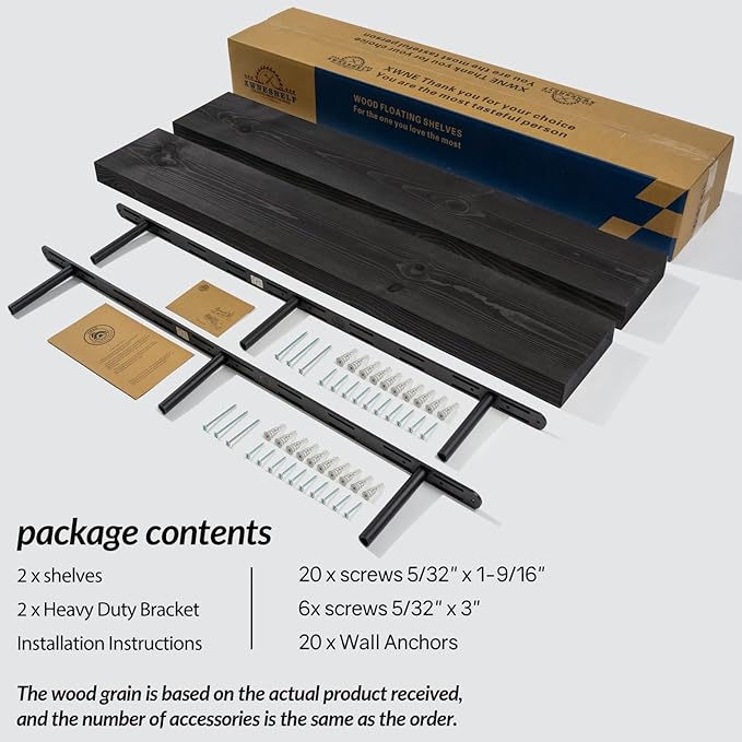 - Solid Wood Floating Shelves: The 48 inch wood Floating Shelf is made from 100% solid pine, selected for its beautiful wood grain texture and knotted into points, with a sanded, hand-stained finish that gives the space a rustic, natural, warm feel. Note: All steps are done by hand and each ledge is slightly different, but equally stunning!