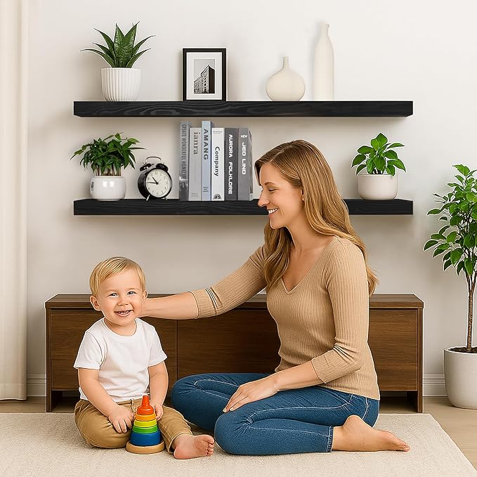 Rusitc Floating Shelves 48 inch Long 8 "deep Set of 2, Heavy Duty Wood Wall Mounted Shelves for Bathroom Living Room Kitchen,Book Shelves with Thickened Hidden Bracket-Black