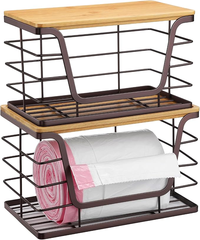 - Easy to Use: The trash bag holder dispenser features a large open space at the front for easy access to put in and take out your items. The stackable bamboo lid can also be used for storing other items, such as snacks