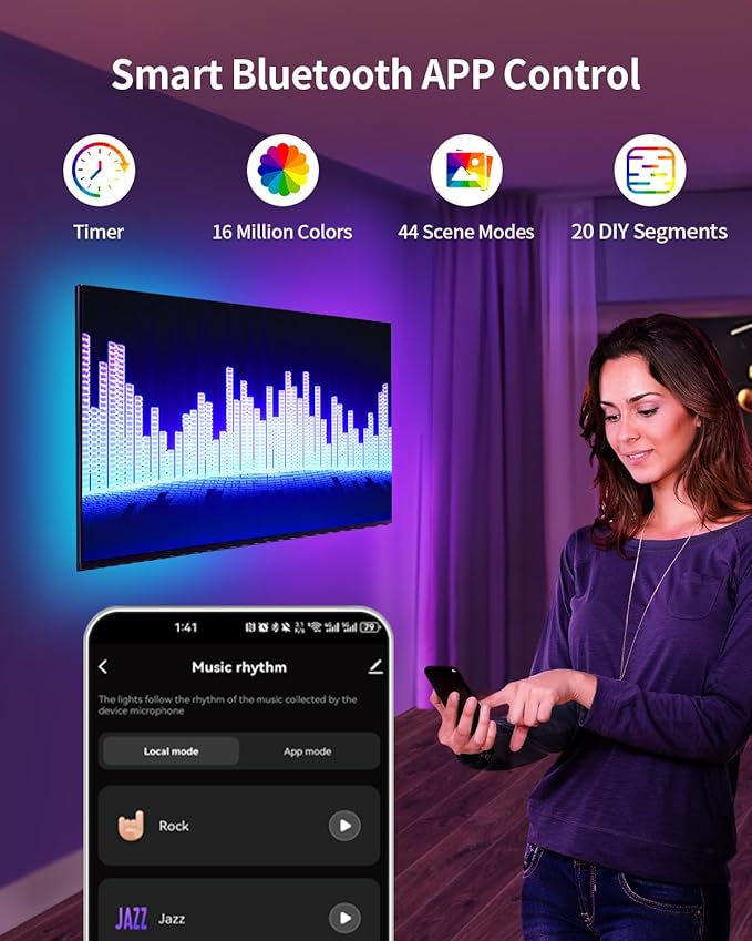 - [Preset Scenes & Music Sync Mode]: Smart LED strip light is equipped with 44 preset scene modes, you can customize exclusive dynamic lighting effect and set up a stunning background light for watching movie, having intimate gatherings or lively parties; It features a built-in high-sensitivity mic in the control box to sync with the music and voice rhythm, perfect for showing vibrant and chasing light, helping you to enjoy immersive visual effect while playing music