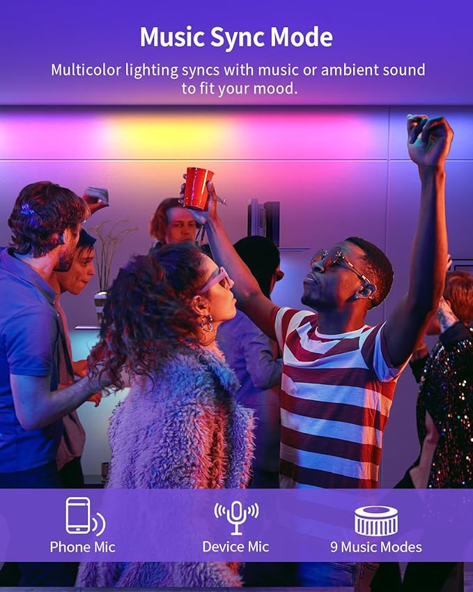 - [Preset Scenes & Music Sync Mode]: Smart LED strip light is equipped with 44 preset scene modes, you can customize exclusive dynamic lighting effect and set up a stunning background light for watching movie, having intimate gatherings or lively parties; It features a built-in high-sensitivity mic in the control box to sync with the music and voice rhythm, perfect for showing vibrant and chasing light, helping you to enjoy immersive visual effect while playing music