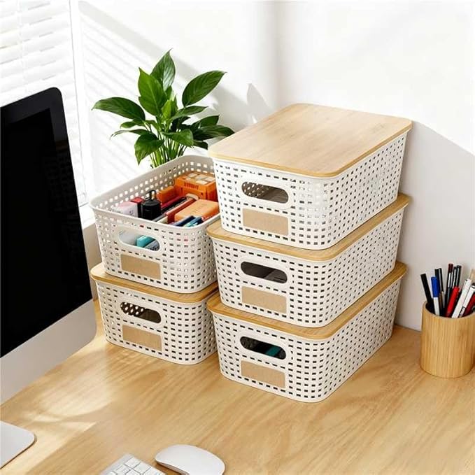 - 【Small Storage Bins with Lids - Check Size!】Our 5QT small storage bins with lids is perfect for organization and storage. Featuring natural bamboo lids and a compact 【10"L x 7.1"W x 4.1"H】 size, each small storage basket offers a 5-quart capacity. BPA-free and non-toxic, our plastic storage organizers are perfect for shelves, for cabinets, for classrooms, under sink, and other tight spaces organization. Ideal for storage pantry items, office and art supplies, cosmetics and medications, or craft material.