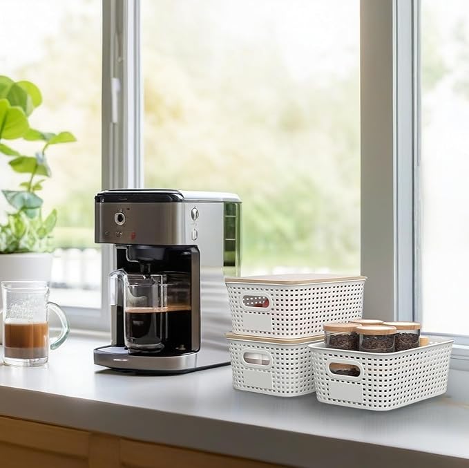 - 【Stackable Storage Basket with Lid for Saving Space】This mini storage basket with lid is designed for efficiency. The stackable design allows you to maximize vertical space on your shelves. When not in use, the organizing bins nest together for compact storage. Side handles make it easy to carry this plastic storage basket with lids from room to room.