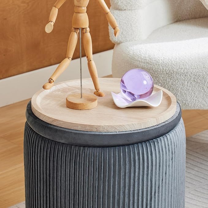Round Ottoman with Storage Set of 2-Upholstered Velvet Vanity Stool for Makeup Multifunctional Ottomans Coffee Table Padded Seat Foot Rest for Living Room&Bedroom (Light Grey-Upgrade Tray Lid)