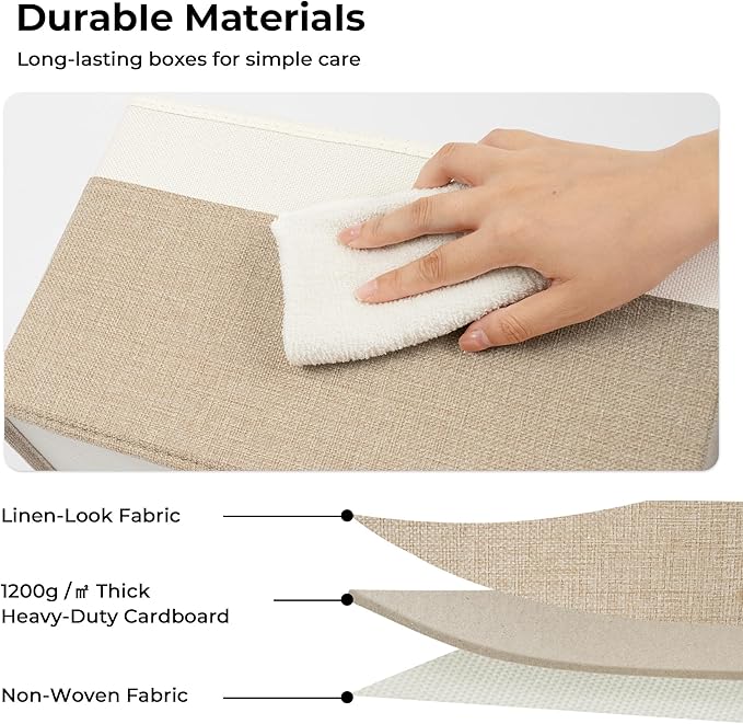 - Eco-Friendly Material - Made of textured linen-like fabric, breathable and wear-resistant, without irritating odor. Fabric boxes come in sets of 3, each measuring 15½"L x 11¾"W x 10¼"H.