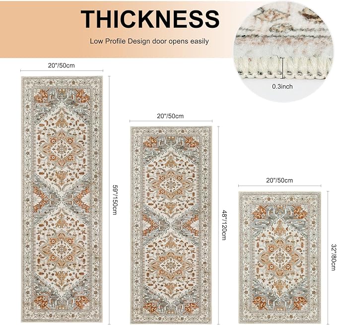- 【Kitchen Runner Rugs Sets 3 Pieces】Yamaziot Boho kitchen rugs measure 20 "x32"+20 "x47"+20 "x59", which can perfectly match your home's decoration style. This vintage runner has elements of bohemian and traditional to give an elegant look to your home