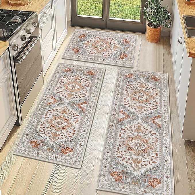 Yamaziot Boho Washable Kitchen Rugs Sets of 3, Non Slip Kitchen Mats for Floor with Rubber Backing, Waterproof & Stain Resistant Thick Carpet Runner Throw Rug for Kitchen, Laundry Room, Hallway