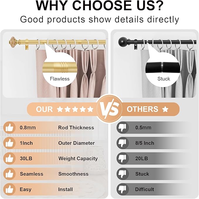 - [LENGTH ADJUSTABLE CURTAIN ROD]: Our brushed gold curtain rod is designed with one side retractable, just adjust the length of the rod, it can be easily applied to all kinds of windows. Each warm gold curtain rod is treated with a precision baking process, the surface is always smooth, and the grommets won't get stuck when sliding the curtains