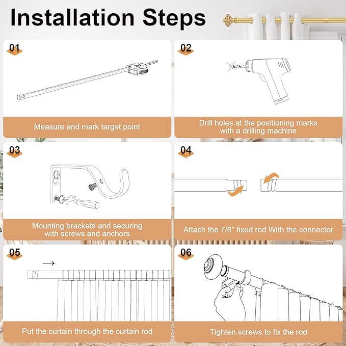 - [EASY INSTALL CURTAIN ROD]: For even simpler installation, this OLV brass curtain rod comes complete with brackets, screws, drywall anchors, and clear instructions for successful installation in just a few easy steps, so you'll have more time to admire your vintage curtain rod. Because of the simple construction of our golden curtain rod, it's very easy to perform daily curtain cleaning