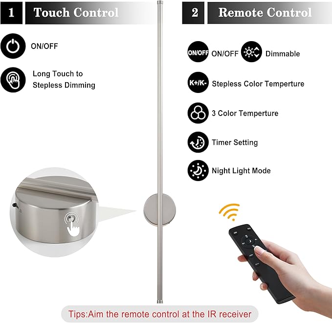 - CONTROL AT YOUR FINGERTIPS: This battery operated modern wall sconce equipepd with a remote control to easily change the setting without getting up. You can also manually touching the light button to directly control the color temperature and brightness