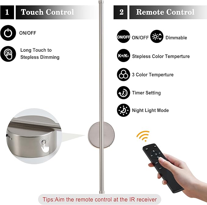 - CONTROL AT YOUR FINGERTIPS: This battery operated modern wall sconce equipepd with a remote control to easily change the setting without getting up. You can also manually touching the light button to directly control the color temperature and brightness