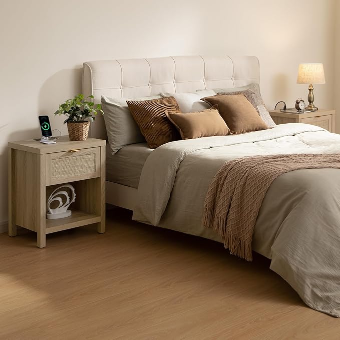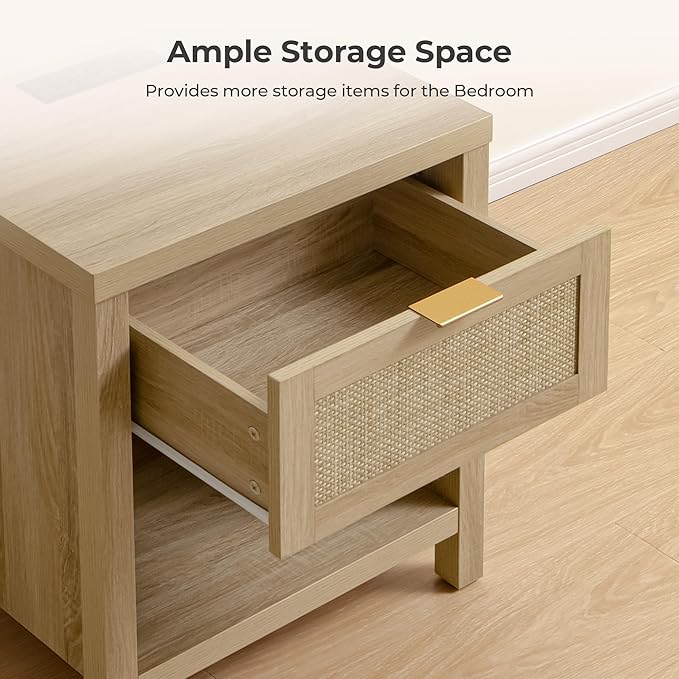 - Farmhouse Nightstand for Modern Homes – This Boho rattan nightstands designed with one drawer and storage open shelf, thickened engineered Wood boards add rustic style and enhance the stability