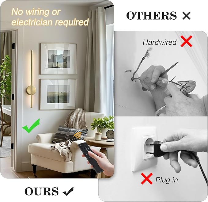 - CONTROL AT YOUR FINGERTIPS: This battery operated modern wall sconce equipepd with a remote control to easily change the setting without getting up. You can also manually touching the light button to directly control the color temperature and brightness