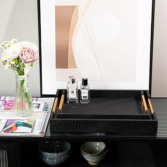 - Stylish and Functional Design: Elevate your living room decor with this 2-piece set of rectangular woven serving trays. Featuring gold handles and a chic faux leather finish, these decorative trays are perfect for adding a touch of elegance to your coffee table or ottoman