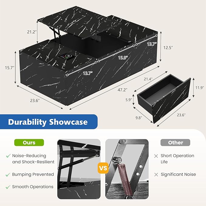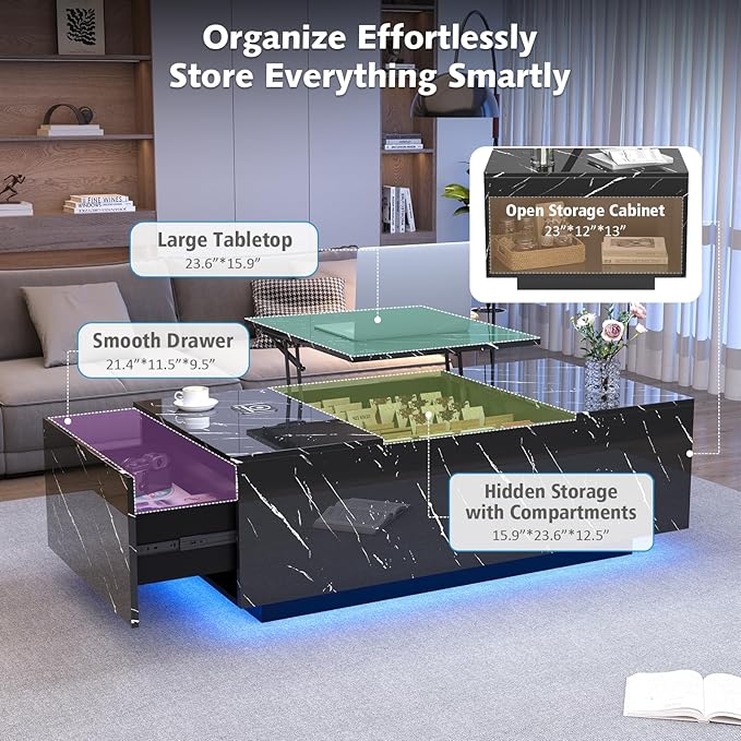 - 【Adjustable Lift-Top Storage Coffee Table】Our oversized coffee table (47.2" x 23.6") combines a high-gloss, waterproof tabletop with multi-functional storage—including a drawer, lift-top hidden compartment, and open shelf. Keeps essentials organized yet within arm’s reach—ideal for modern living rooms.