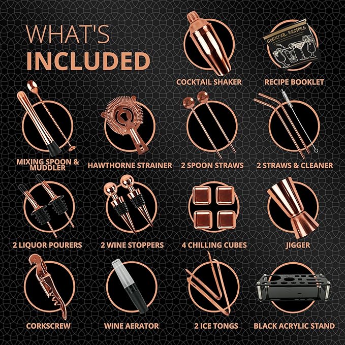 - 24 PIECE BARTENDER SET: Our mixology bartender set includes a 24oz cocktail shaker, mixing spoon, muddler, strainer, straw cleaner, 2 spoon straws, 2 straws, 2 liquor pourers, 2 wine stoppers, 4 chilling cubes, jigger, corkscrew, wine aerator, 2 ice tongs, recipe booklet and an acrylic stand. All the necessary tools to be a top-notch bartender.