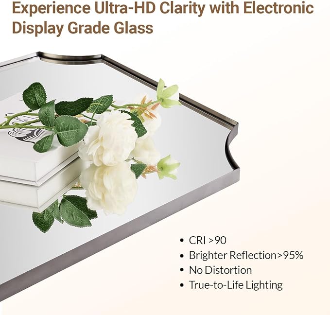 - 【Rust-Proof Stainless Steel Frame】: (N.W:24LBS). Crafted from stainless steel with oxidation-resistant properties, this mirror for bathroom offers enhanced stability and a longer lifespan. Shatterproof 4mm HD glass is supported by a 9mm MDF backboard (most others just 3mm ), surrounded by a 1/17" gap with a unique curved corner design to give a seamless finish