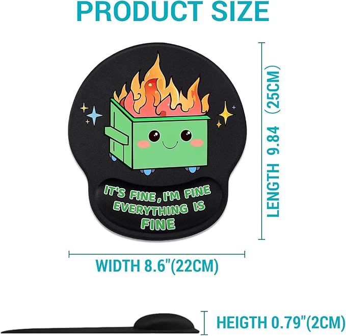 - 【Novelty Mouse Pad】This mouse pad with wrist rest features a cute funny dumpster on fire pattern design: It's Fine I'm Fine Everything is Fine, which will bring you more happiness while working, studying or playing. The funny mouse pad for desk also fits all types of desktop, keyboard, laptop and wireless computer mouse.