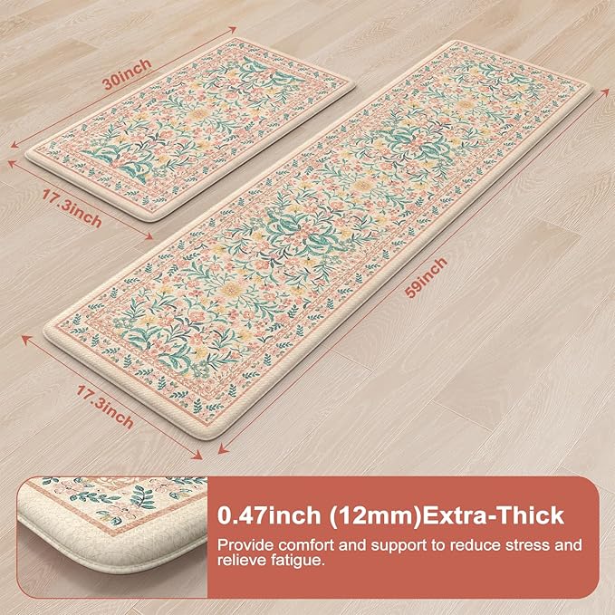 Collive Anti Fatigue Mats for Kitchen Floor, Cushioned Spring Kitchen Mat Comfort Waterproof Padded Sink Rugs Non Slip, Boho Floral Standing Rug for Office, Home Decor, 17"x30"+17"x59", Pink