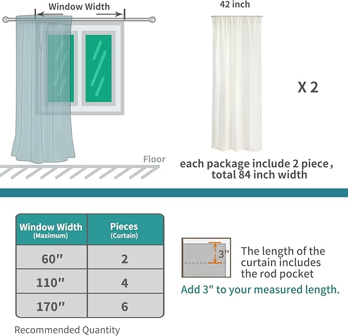 - PACKAGE INCLUDES: Each package includes set of 2 natural linen curtains. Each panel is 63 inches long and 42 inches width (total 63 inches long and 84 inches length), with 3 inches rod pocket on top, fits most standard rods and makes the maximize coverage of your windows