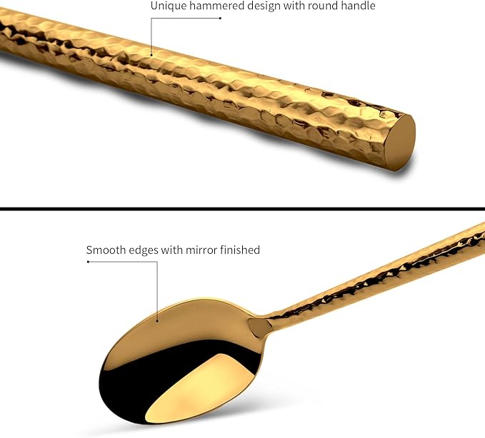 - 【APPEARANCE AND DESIGN】Shiny gold color and mirror polish, elegant design with round hammered handle, dishwasher safe