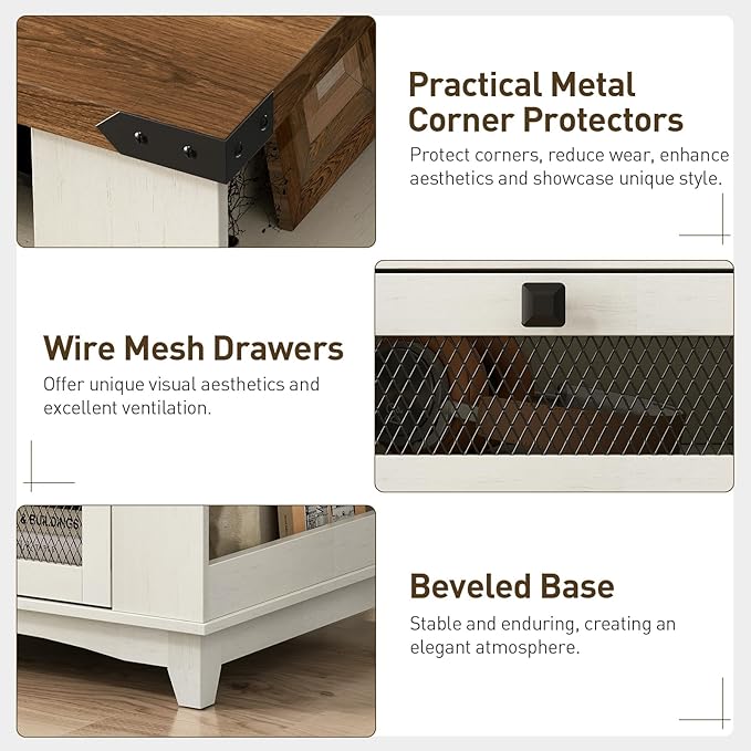 - Elegant Farmhouse Style: Boasting a square structure with a beveled base, the nightstand in white and walnut is detailed with metal corners, wire mesh drawers and diamond handles, offering a warm farmhouse look that complements various interiors