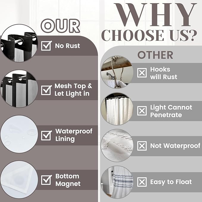 - 【Translucent top】: The translucent mesh on the top of the no hook shower curtain allows light to enter the room, protecting your privacy while letting light in your bathroom