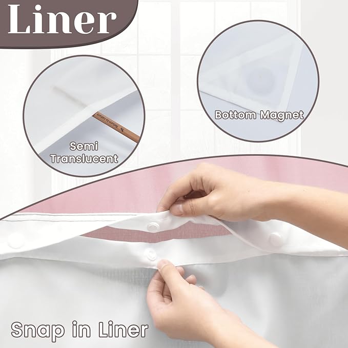 No Hook Slub Textured Shower Curtain with Snap in Liner - Pink Fabric Outer Curtain & Waterproof Inner Liner, Hotel Style with See Through Top Window, 71x74 in