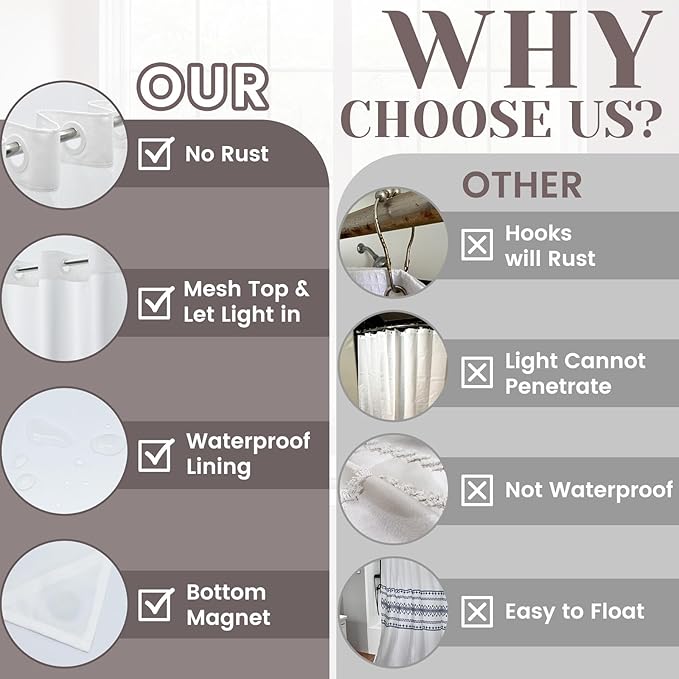 - 【Translucent top】: The translucent mesh on the top of the no hook shower curtain allows light to enter the room, protecting your privacy while letting light in your bathroom