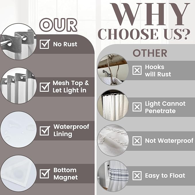 - 【Translucent top】: The translucent mesh on the top of the no hook shower curtain allows light to enter the room, protecting your privacy while letting light in your bathroom