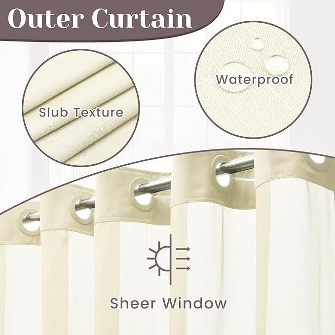 No Hook Slub Textured Shower Curtain with Snap in Liner - Sand Fabric Outer Curtain & Waterproof Inner Liner, Hotel Style with See Through Top Window, 71x74 in