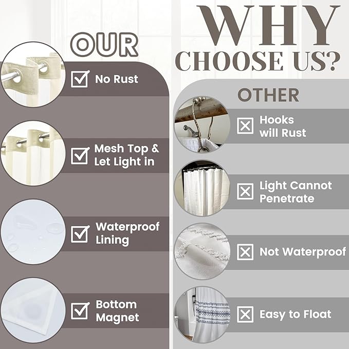 - 【Translucent top】: The translucent mesh on the top of the no hook shower curtain allows light to enter the room, protecting your privacy while letting light in your bathroom