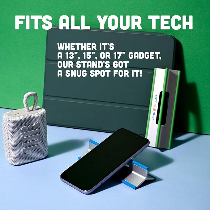 - FITS ALL YOUR TECH - This macbook stand for desk is compatible with all devices such as iPad wedge or iPad writing stand, iPhones, Laptops, Air, Pro, HP, Dell, Lenovo, Smartphones, Tablets, Samsung Galaxy, Androids, Kindle, Amazon Fire & video projectors. Enjoy Steepy's raised laptop stand for desk.