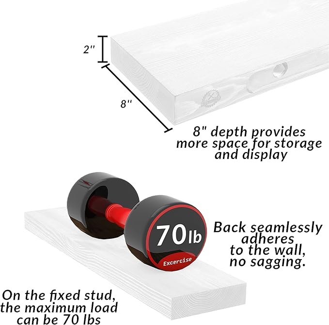 Rustic Floating Shelves 60 inch Long 8 "deep Set of 2, Heavy Duty Wood Wall Mounted Shelves for Bathroom Living Room Kitchen,Book Shelves with Thickened Hidden Bracket-White