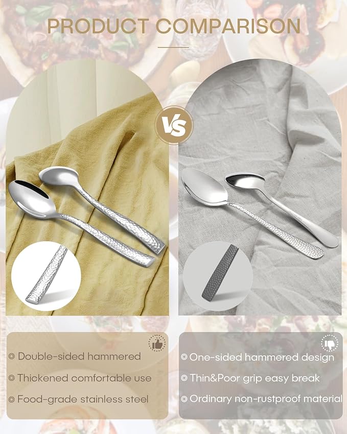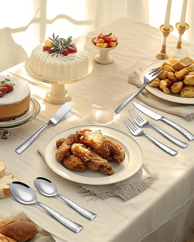 - Premium Heavy Duty Crafted: Hammered Flatware Set made of thick gauge food-grade stainless steel offers durability, rust&corrosion resistance. Enhanced by the advanced hot forged process to strengthen durability, never bends or chips in daily use, ensuring the longest-term value and optimal performance for using