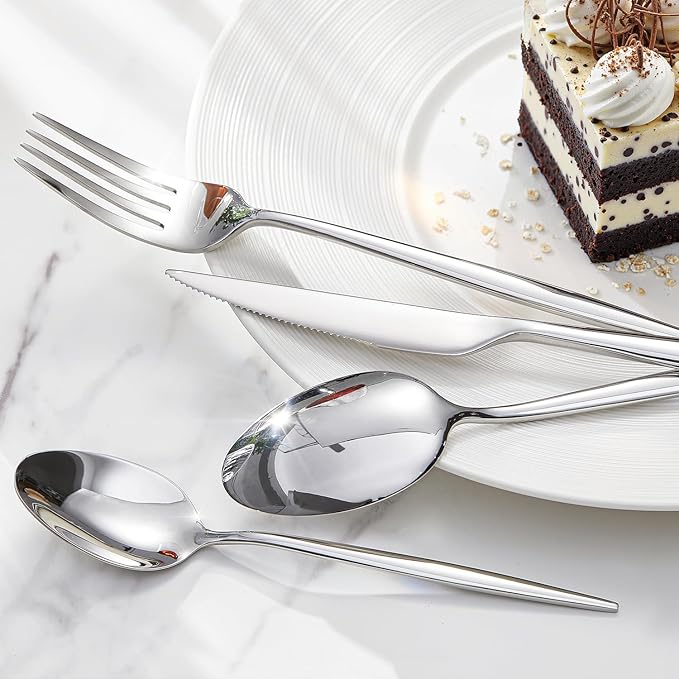 - Complete Set for Every Occasion: This shiny silver flatware set is perfect for Thanksgiving Day, Mother's Day, Housewarming, Wedding, Restaurant, Hotel or Daily Use. Simple classic modern design would match well with your existing cutlery and elevate everyday meals into a fine dining experience.