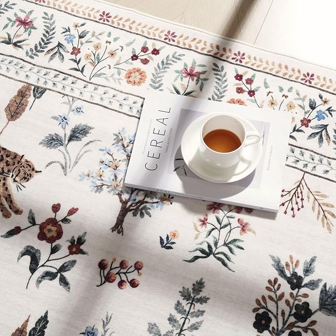- Intriguing Animal and Floral Design—This floral animal rug woven by machine, The Vibrant-inspired design is digitally printed which details can’t be replicated by hand. Vibrant floral carpet patterns Intriguing adorn the spaces in your home, including the living room, bedroom, dining room, entryway, children's playroom, home office, kitchen, and more.