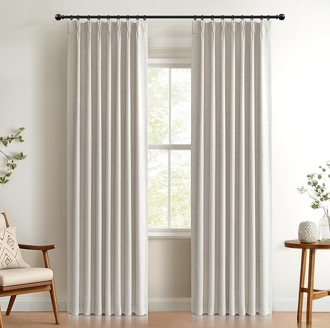 - Pinch Pleated Drapes:The elegant pinch pleat design effortlessly enhances the beauty of any room. Made with premium polyester and a linen-looking finish, it reduces wrinkles while giving you the natural appearance of linen, all with easy care.