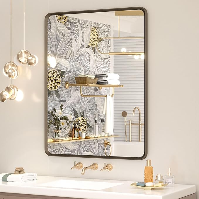 - 【Durable Brushed Bronze Bathroom Mirror】Enhance your space with its sleek rounded-rectangle design, the modern bronze framed mirrors upgrade your bathroom's style and functionality effortlessly. Crafted with anti-rust, moisture-resistant metal frame for long-lasting durability—perfect for humid bathrooms.