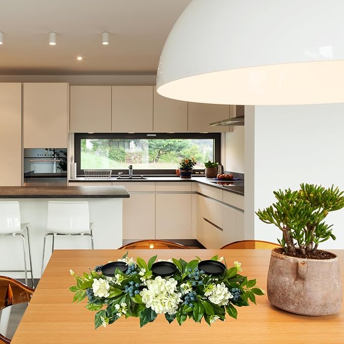- Elegant Floral Design: Features a beautiful mix of artificial blueberries, white hydrangeas, and eucalyptus leaves, creating an elegant centerpiece for any table setting