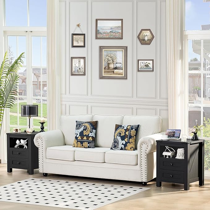 - [End Table with Charging Station] Our end table with storage comes with 2 standard AC outlets and 2 USB ports. This tall nightstand makes it more convenient for you to charge your cell phone and other devices at any time. A 2.3" round hole is designed on the back to help you organize the outlet power cord and charging cables, making the desktop more tidy.
