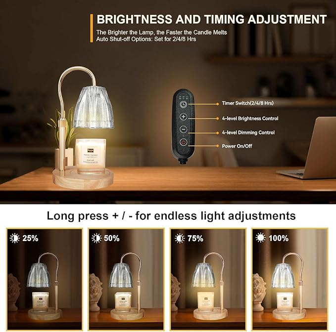 - [Adjustable Brightness & Timer Function]: This wax melting lamp features adjustable brightness and a timer function with options for 2 hours, 4 hours, and 8 hours. The candle warmer has 4 levels of height temperature adjustable, you have the flexibility to control the melting speed of the candle by adjusting the candle lamp's brightness. Additionally, you can set the heating time according to your personal needs to ensure the safety of candle usage.