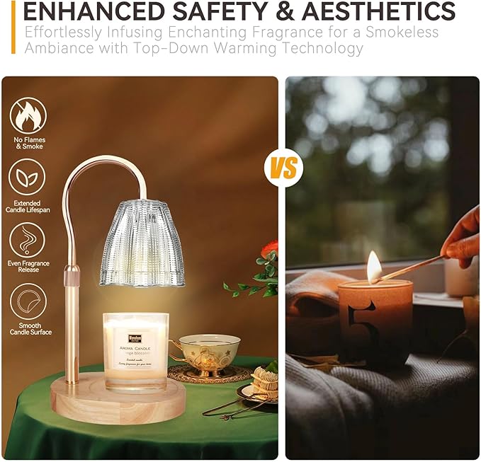 - [Exquisite Home Décor]: The candle lamp is crafted with a natural wooden base, sleek metal lamp body, and a glass lampshade, creating a blend of classical and modern design. The bottom is equipped with non-slip pads, ensuring stability and protecting furniture from scratches. Ideal for placement in living rooms, bedrooms, studies, offices, yoga rooms, and more, this candle warmer lamp is not only aesthetically pleasing but also highly functional.