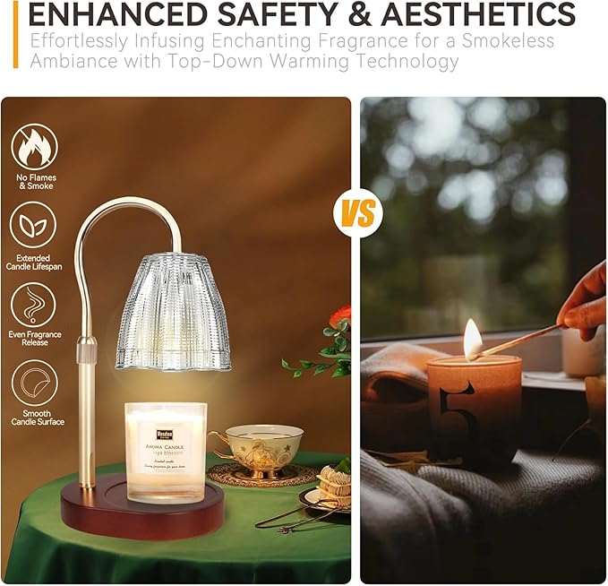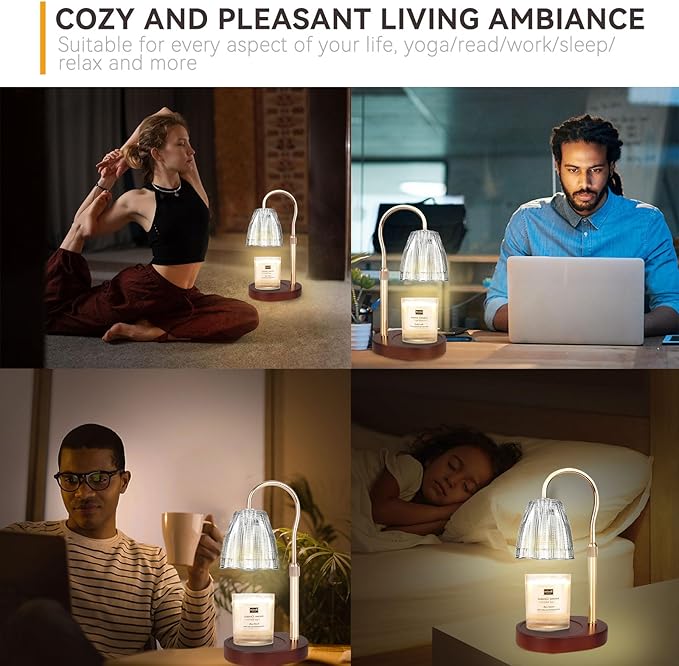 - [Exquisite Home Décor]: The candle lamp is crafted with a natural wooden base, sleek metal lamp body, and a glass lampshade, creating a blend of classical and modern design. The bottom is equipped with non-slip pads, ensuring stability and protecting furniture from scratches. Ideal for placement in living rooms, bedrooms, studies, offices, yoga rooms, and more, this candle warmer lamp is not only aesthetically pleasing but also highly functional.