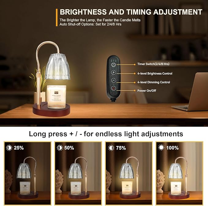 - [Adjustable Brightness & Timer Function]: This wax melting lamp features adjustable brightness and a timer function with options for 2 hours, 4 hours, and 8 hours. The candle warmer has 4 levels of height temperature adjustable, you have the flexibility to control the melting speed of the candle by adjusting the candle lamp's brightness. Additionally, you can set the heating time according to your personal needs to ensure the safety of candle usage.