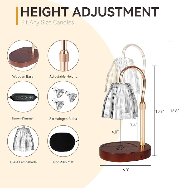 - [Adjustable Height, Fits All Candle Sizes]: The candle lamp warmer comes with a 6.3-inch oval-shaped wooden base and the height-adjustable lamp pole, allowing compatibility with candles of all sizes.