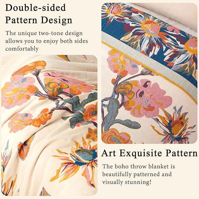- Ultra-Soft, Premium 100% Cotton:Experience cloud-like comfort with our bohemian throw blanket, crafted with a innovative 4-layer breathable cotton fiber structure for exceptional lightness and fluffiness. Its superior moisture-wicking ability quickly absorbs moisture, keeping you dry and comfortable all day. The anti-pilling treatment ensures long-lasting durability and maintains its softness wash after wash.