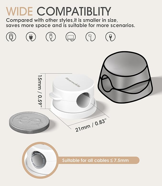 - 【7.5 mm Perfect Cable Slot Diameter】The 0.3inch (7.5mm) diameter can hold most cables, such as mobile phone charging cables, USB cables, HDMI thick cables, computer power cables, etc. Moreover, it can ensure that the charging cable as small as the iPhone original charging cable is fixed and does not fall off, pulled out smoothly