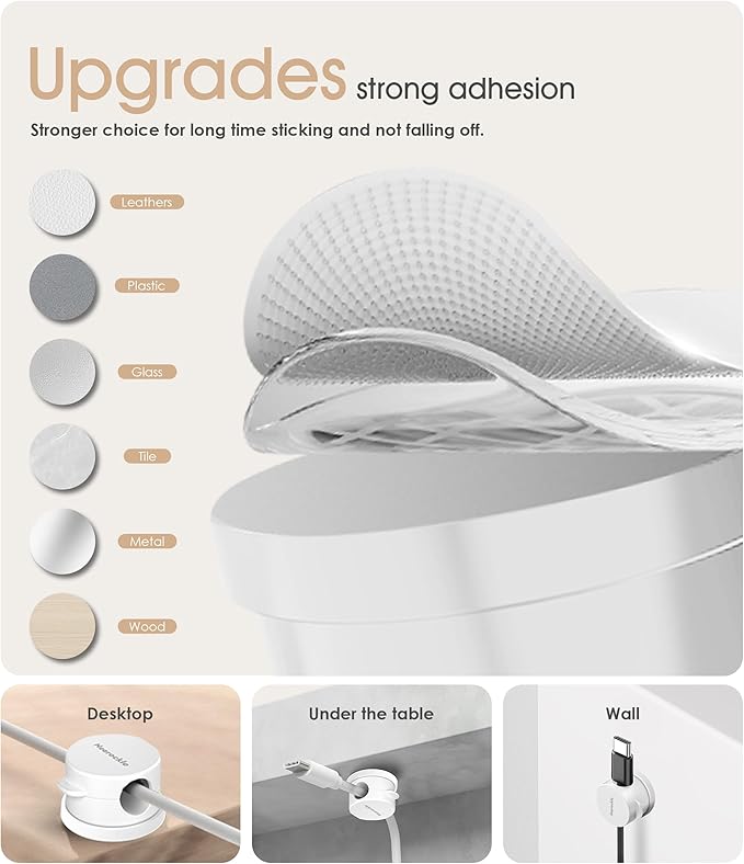 - 【No-Residue Acrylic Adhesive】Using upgraded acrylic adhesive, it is stronger and will not leave any residue when peeled off. Simply stick the cable organizer to any smooth, dry surface such as a wooden table, glass or tile, etc. the transparent adhesive pads won't damage your table, nightstand or walls. [Warm Tips: Please clean the desired surface without dust before sticking, and keep pressing for 30 seconds to enhance the adhesion of the sticky pad. Highly recommend waiting for 1 hours for better use]